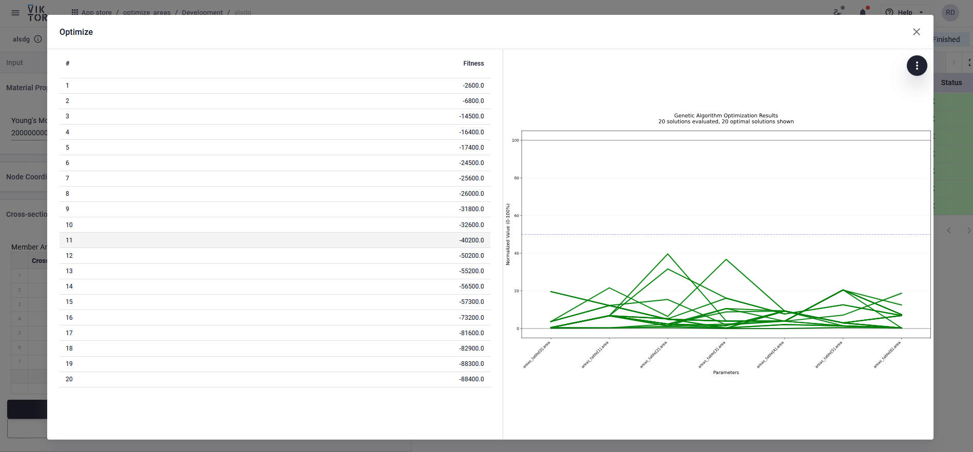 This is generally where optimizations come in, and I’d use the OptimizationButton. However with this truss, I have 7 cross sections with a configurable area. I need a smarter optimization button.