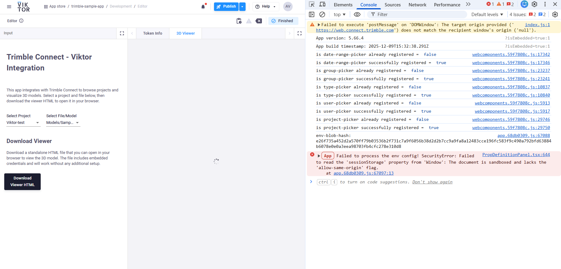 Something similar happened to me when I was building the Trimble Connect–VIKTOR integration. The viewer failed during startup with an error saying it couldn’t read ‘sessionStorage’. I think this is because VIKTOR loads the viewer inside a sandboxed iframe without ‘allow-same-origin’, so the iframe ends up with origin null and Web Storage is blocked.